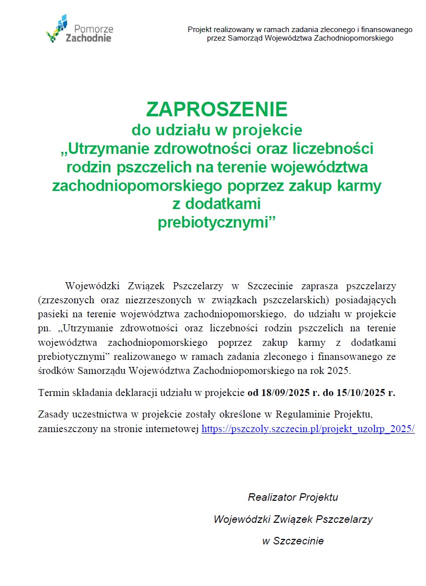 Wojewódzki Związek Pszczelarzy w Szczecinie zaprasza pszczelarzy (zrzeszonych oraz...