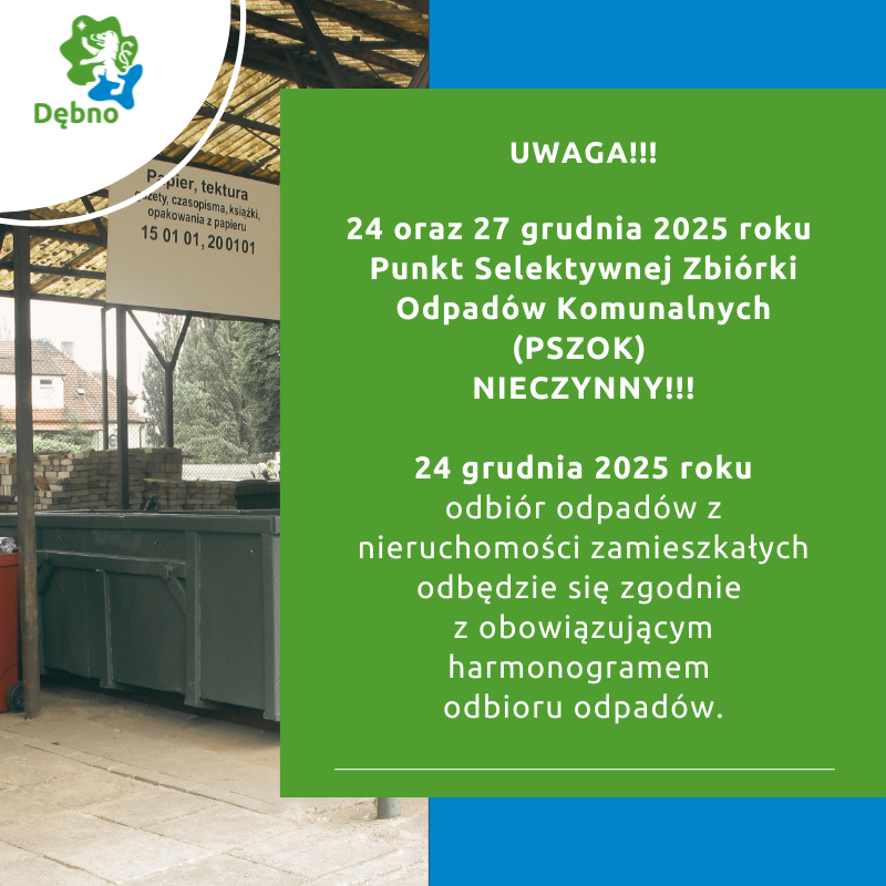 Uprzejmie informujemy, że 24 oraz 27 grudnia 2025 roku Punkt Selektywnej Zbiórki Odpadów...