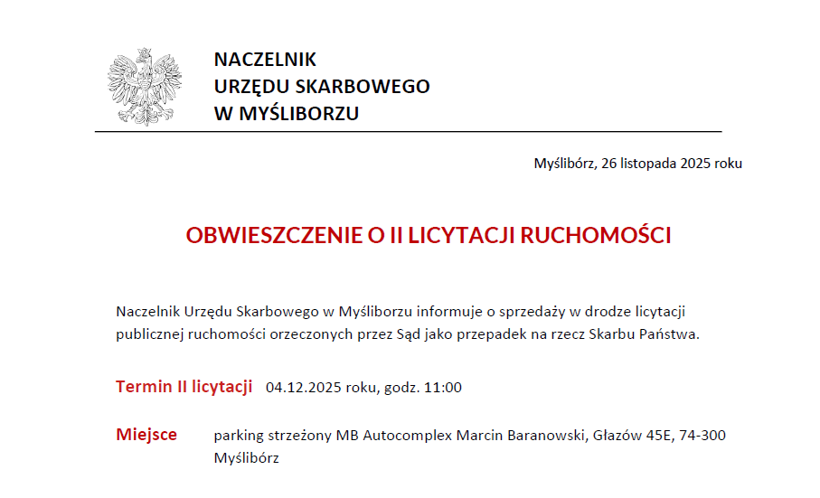Naczelnik Urzędu Skarbowego w Myśliborzu informuje o sprzedaży w drodze licytacji publicznej...