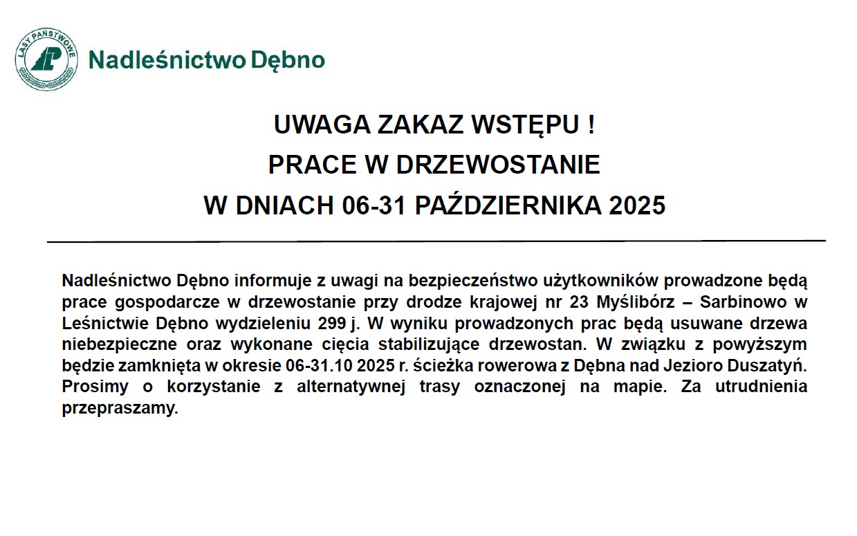 Nadleśnictwo Dębno informuje z uwagi na bezpieczeństwo użytkowników prowadzone będą prace...